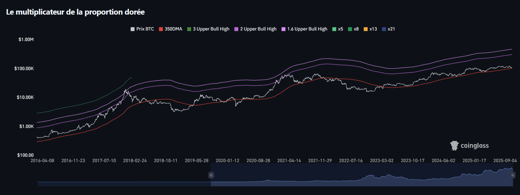 Basé sur les moyennes mobiles (notamment la 350DMA) et les multiples de Fibonacci (x1.6, x2, x3, etc.), cet indicateur identifie les zones d’accélération parabolique du prix.