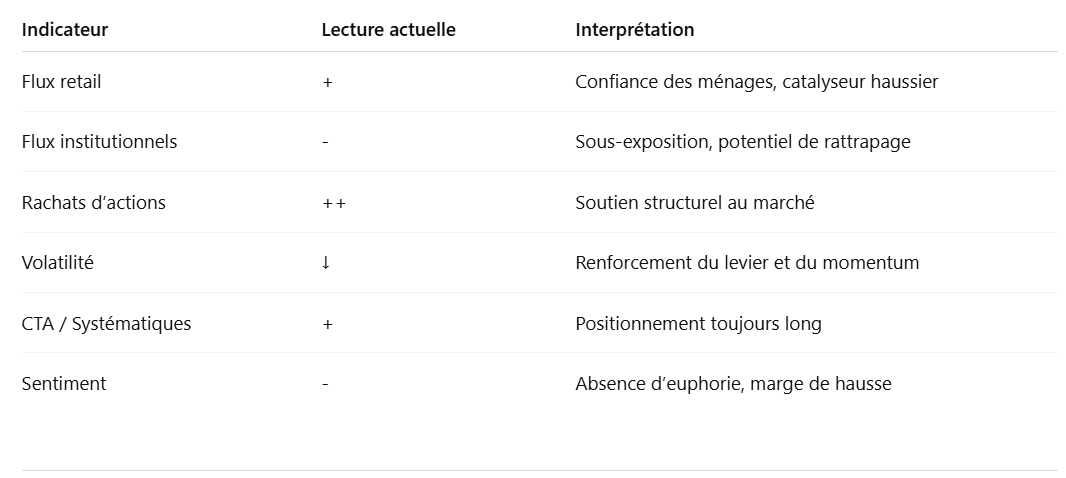 Lâabsence de pression macro, la reprise des rachats dâactions et la force du retail crĂ©ent un environnement propice Ă un âmelt-upâ ordonnĂ©, oĂč la prudence des institutionnels agit comme carburant supplĂ©mentaire.
